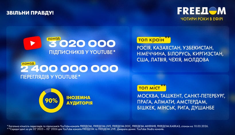 *** Вимірювання дивлення каналів ДП “МПІУ” через супутник, ефір, в мережах кабельних операторів різних країн не проводилось протягом усього періоду роботи підприємства через високу вартість таких досліджень. Відповідно, при аналізі кількісних та якісних показників дивлення та запитів глядацької аудиторії медіабрендів ДП “МПІУ”, підприємство орієнтується на дані діджитал-платформ, зокрема YouTube. Дані, наведені в матеріалі, станом на 10.03.2026. Джерела даних: аналітичні інструменти діджитал-платформ; Google Analytics; YouTube Studio каналів FREEДОМ та партнерів, дані компанії SubSub.
