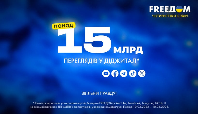 Загалом за чотири роки роботи матеріали під брендом FREEДОМ на всіх діджитал-майданчиках іномовлення та на майданчиках наших партнерів — українських медіагруп 1+1 media, Starlight Media, Inter Media Group — отримали 15 млрд переглядів, з них на діджитал-майданчиках іномовлення (YouTube, Facebook, Telegram, TikTok, X) — 4,1 млрд. Загальна кількість підписників діджитал-майданчиків FREEДОМ наразі становить 3,7 млн.